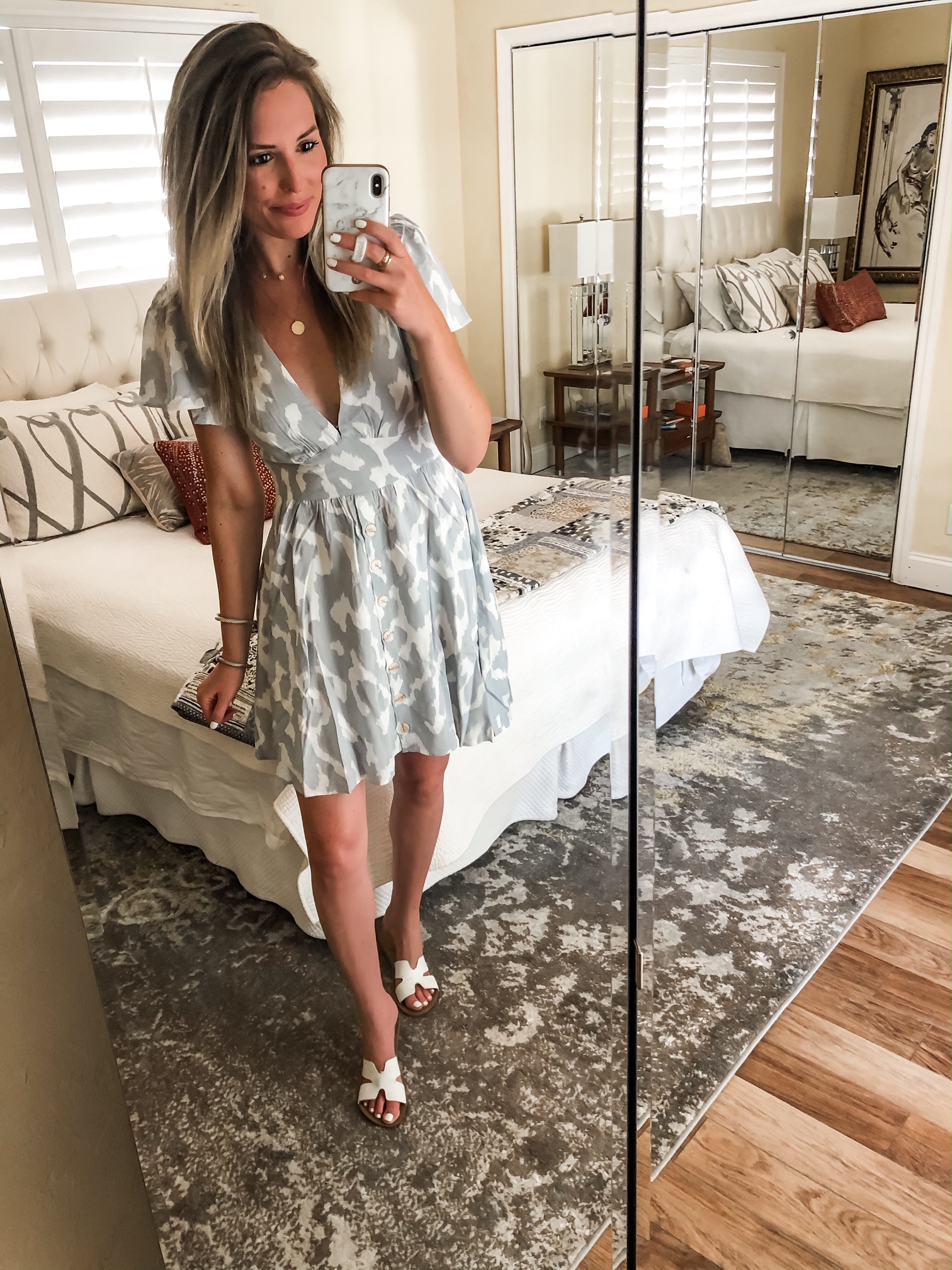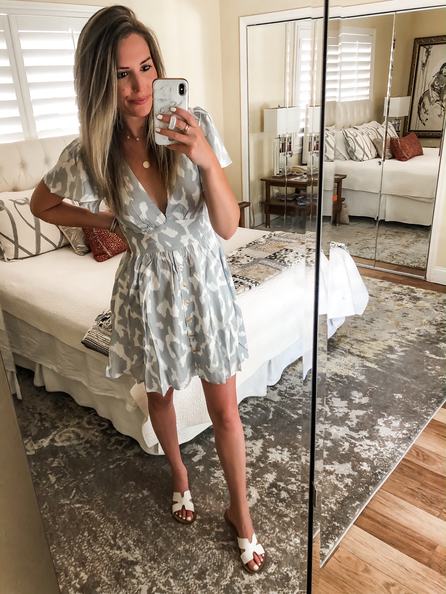 Ok I had a hard time deciding which dress I love more – this one or the leopard print dress above! They are both super cute, but very different. The plunging v-neck on this dress is super flattering for me because I don’t have a big chest. I do have a regular bra on and you can’t see it – so that’s a plus!